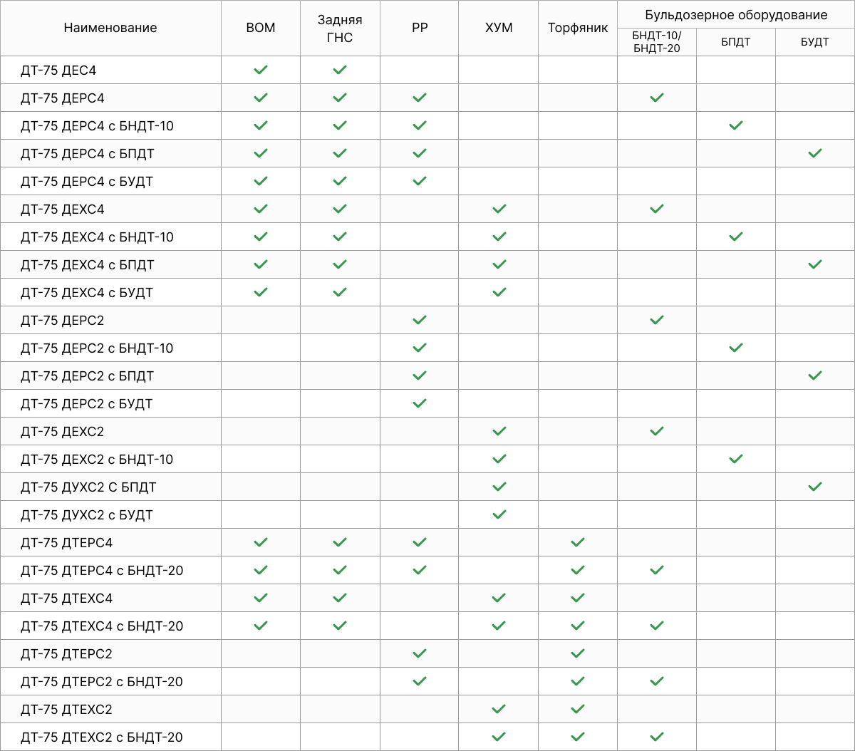 Бульдозеры ДТ-75 могут быть оснащены различными видами бульдозерных отвалов, что позволяет использовать его для выполнения самых разных задач - от уборки снега до работ с грунтами и сыпучими материалами. Благодаря наличию задней навески и вала отбора мощности(ВОМ), трактор ДТ-75 может работать с большим спецтром прицепного и навесного оборудования, что делает его еще более универсальным и удобным в использовании.